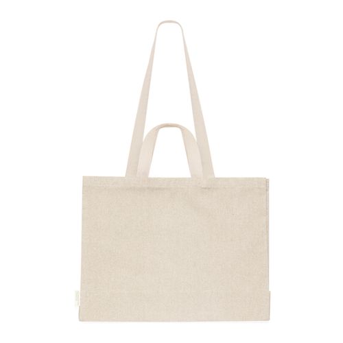 Diese robuste Tasche besteht aus recycelter Baumwolle mit einem Gewicht von 150 gr./m2. Durch den Boden- und Seitenfalten bietet sie überraschend viel Platz und trägt bis zu 10 kg. Dank der doppelten Griffe – lang und kurz – lässt sie sich sowohl in der Hand als auch über der Schulter tragen. Eine nachhaltige Wahl also, nicht nur wegen des Materials, sondern auch, weil sie zu wiederholter Nutzung anregt.