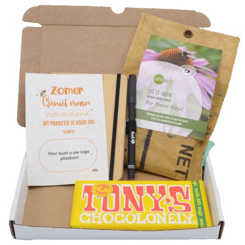 Suchen Sie ein besonderes Geschenk für Ihre Mitarbeiter? Am liebsten eines, das durch den Briefkasten passt? Dann ist dieses exklusive Paket perfekt. Das Paket enthält eine Tony Chocolonely-Schokolade, einen A6-Bambook, ein Saatset mit Bienensamen und eine Samenpapierkarte. Sie können Ihr eigenes Design für die Karte entwerfen. Das Bambook ist ein löschbares Notizbuch. Notizen können mit einer App digitalisiert werden. Ideal, da das Notizbuch endlos verwendbar ist. Zusätzlich wird für jedes verkaufte Bambook ein Baum gepflanzt.