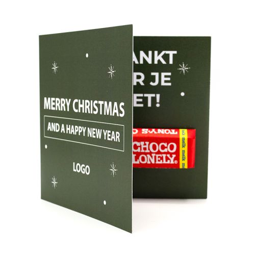 Eine Weihnachtskarte an Mitarbeiter oder Geschäftsverbindungen verschicken? Mit dieser Variante punkten Sie auf jeden Fall, denn im Inneren befindet sich ein leckerer Tony-Riegel (50 gr.). Das ist Fairtrade Schokolade, bei der die Bauern einen fairen Preis für ihren Kakao erhalten. Sie können aus 6 verschiedenen Geschmacksrichtungen für den Riegel wählen.